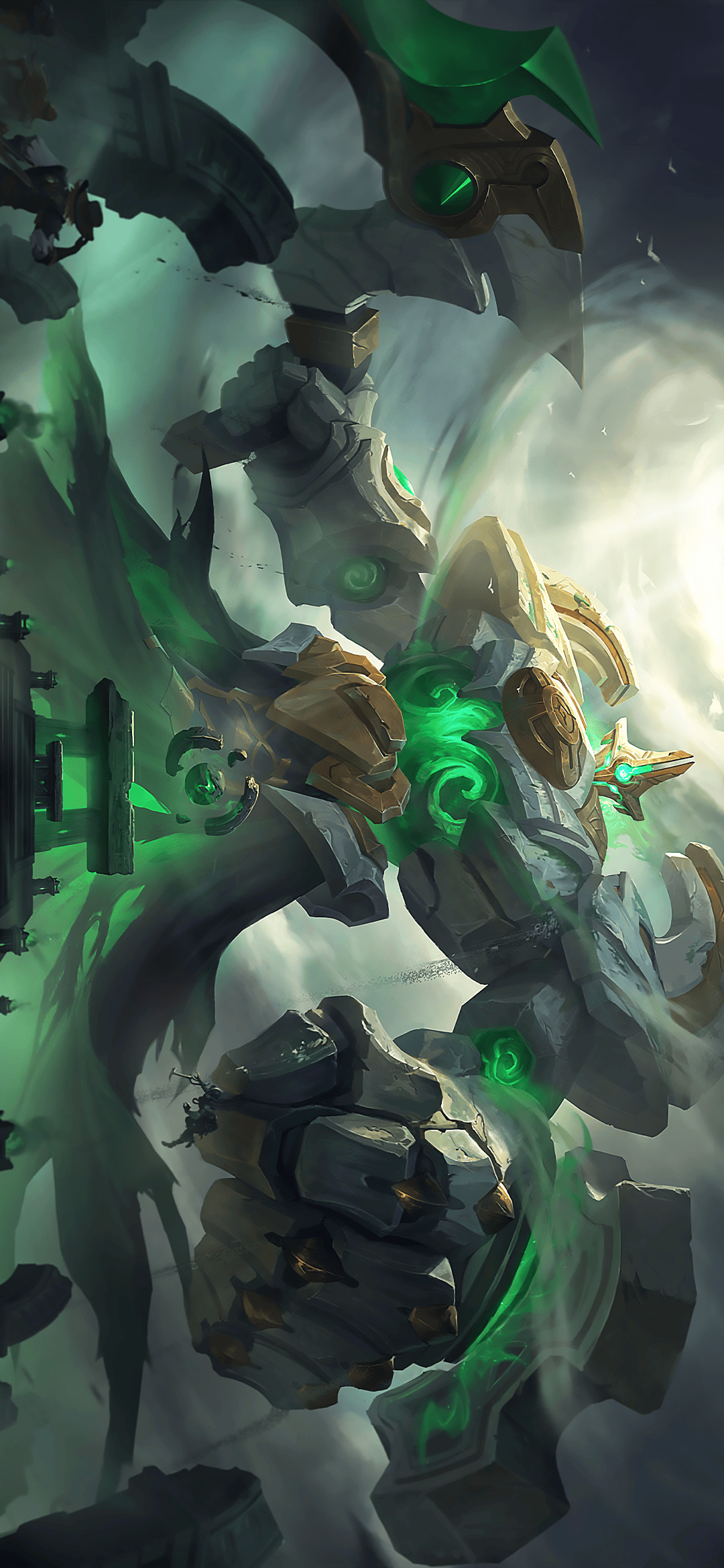 皮肤特色:铠甲设计借鉴遗迹建筑造型,石块与灵力组合成高大守护者形象,头顶绿光,技能特效以绿色为主,释放技能时仿佛蕴含神秘力量。