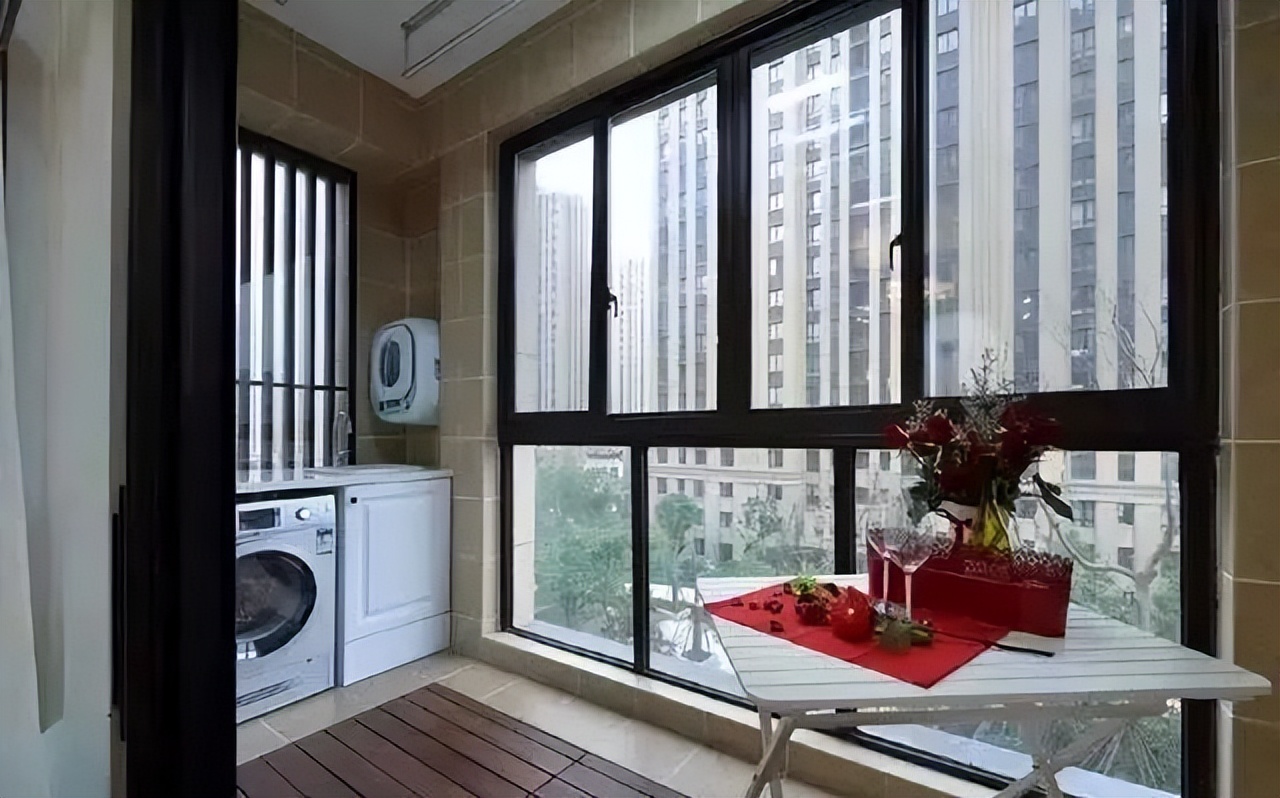 阳台放置着洗衣机,还有一张休闲桌和一束鲜花,浪漫的氛围弥漫其中。地面做了木条的木地热装饰,让整个阳台更具档次。