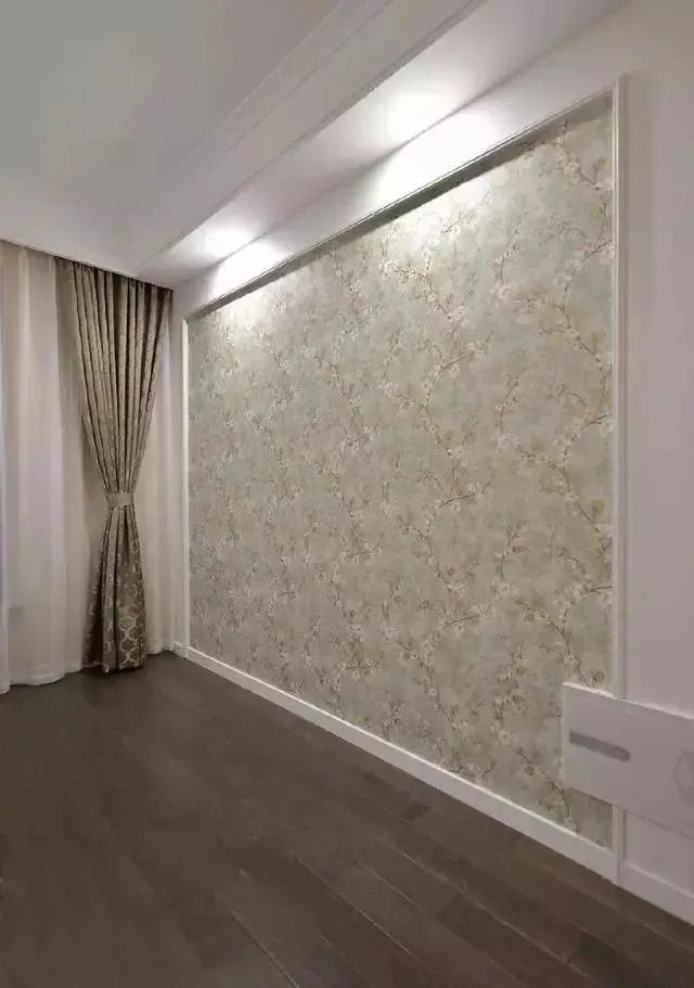 次卧暂时还没有购买床,碎花纹的背景展现出了美式的清新风格,实木地板则透露出稳重大气。