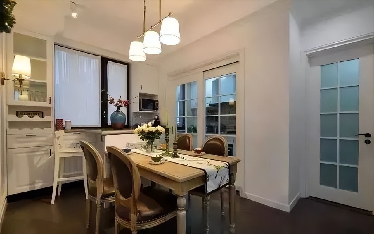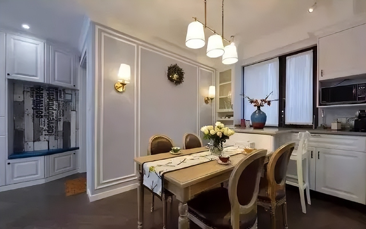 从大门进来,房子中间的位置可以看到餐厅,整个空间宽敞又明亮。餐厅里那圆润的长方形餐桌,搭配着软垫的餐椅,显得别具一格。餐厅浅蓝色的背景墙上搭配着两盏壁灯,在石膏线的勾勒下,餐厅的层次变得更加丰富。窗边还设计了实用的餐边柜。