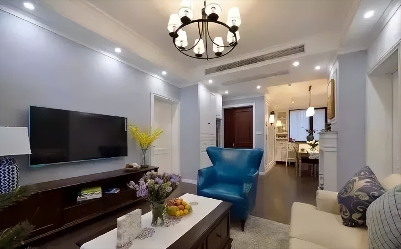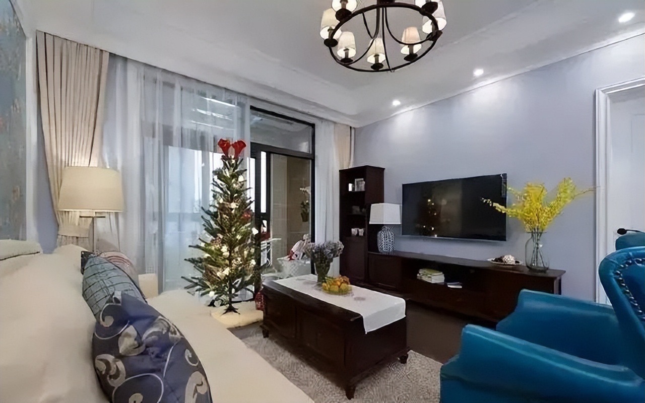 来到客厅,一组实木家具稳稳地放置其中,彰显出客厅的沉稳与高贵。电视墙刷上了浅蓝色的墙漆,再加上一张蓝色的沙发椅,让人仿佛能感受到清新自然的气息在空气中流淌。一套布艺沙发,搭配上蓝色拼花的壁纸,在石膏线精心勾勒的背景下,显得高贵又典雅,满满的都是美式风情。客厅那宽敞的窗户让采光格外好,阳光倾洒进来,满是温暖与明亮。