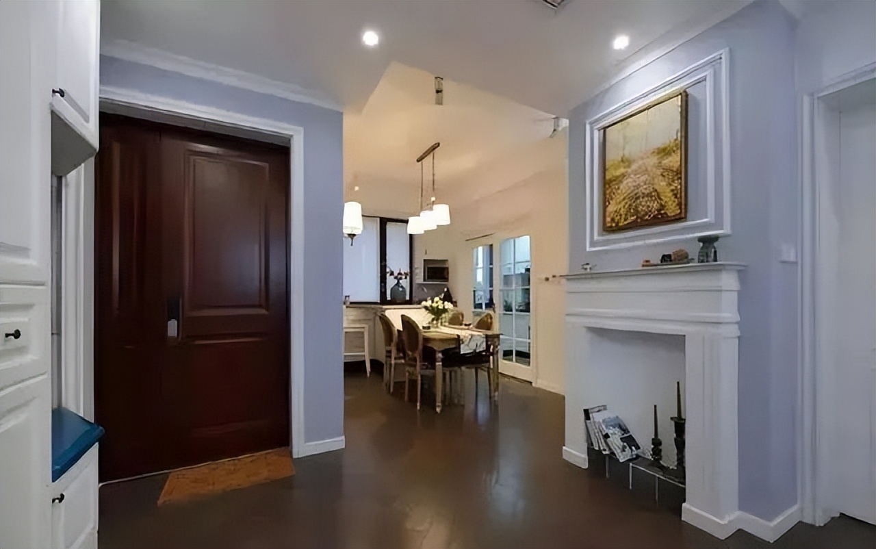 进入玄关后,还有一个充满创意的壁炉元素设计,搭配上一幅精美的挂画以及用石膏线勾勒出的背景墙,让整个空间瞬间提升了一个档次。地面采用的实木地板,人字拼的设计让地板显得更加漂亮高贵。