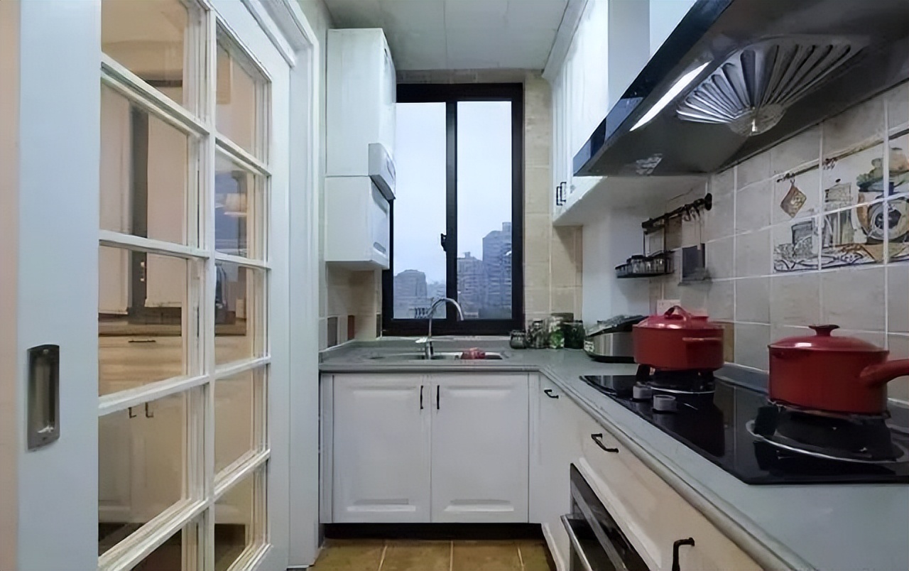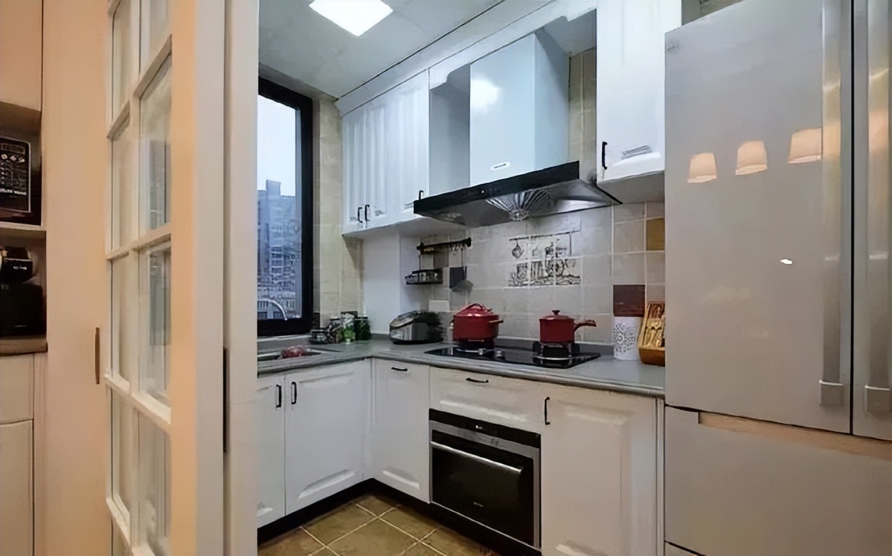 透过玻璃门的厨房门,可以隐约看到厨房的空间,灯光的营造让这里充满了温馨的氛围。厨房的空间虽然稍显紧凑,但 L 型的布局让空间得到了更合理的利用。双开门的冰箱足够满足一家人的日常使用。白色的橱柜显得大气而整洁,暖灰色的墙面和灰色的台面更是为厨房增添了一份独特的个性。