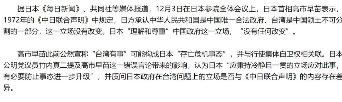 根据日本爆料,中俄达成了共识以后,高市早苗政府紧急召开国会,忽然搬出了《中日联合声明》重点提及这份文件的合法性。这意味着高市早苗政府现在不仅承认了世界上只有一个中国,而且还认可台湾是中国内政。