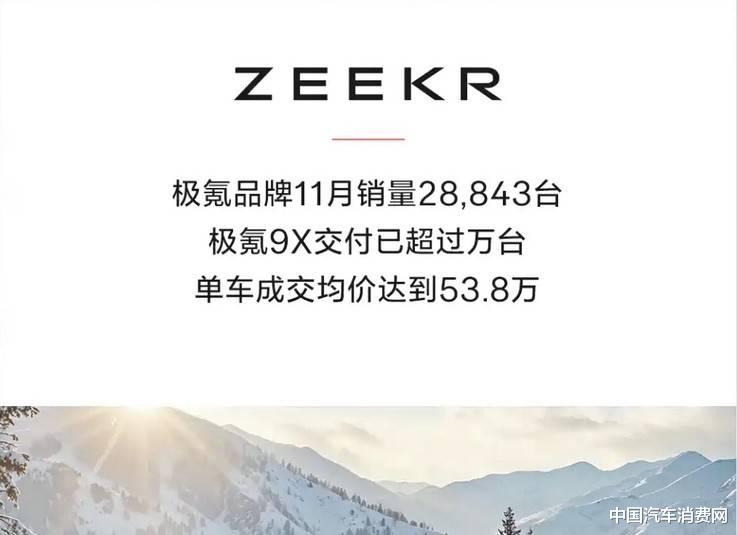 极氪汽车今年11月销量为28843辆,极氪9X交付超过万台(单车成交均价53.8万),新车是极氪今年推出的最重磅车型,9月29日正式上市,定位当下较火的全尺寸SUV,新车集诸多黑科技于一身,竞争问界M9/理想L9等车型。