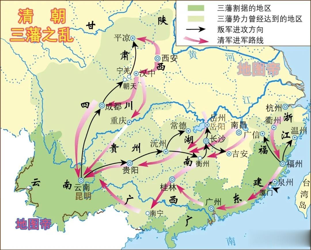 1674年,郑经拿下福建的泉州、漳州和广东的潮州、惠州等地,这些地方本是三藩的势力范围,于是双方矛盾激增,互相猜忌甚至军事对抗。