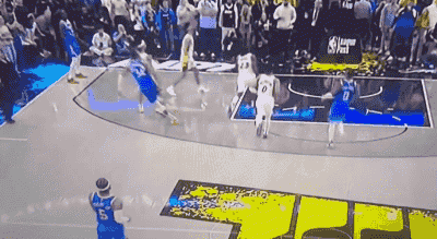 步行者边线球成功发出,跑来接球的哈利伯顿加速溜到了底角,迎着拍马赶到的坤坤甩出了一记超高难度顶投三分!