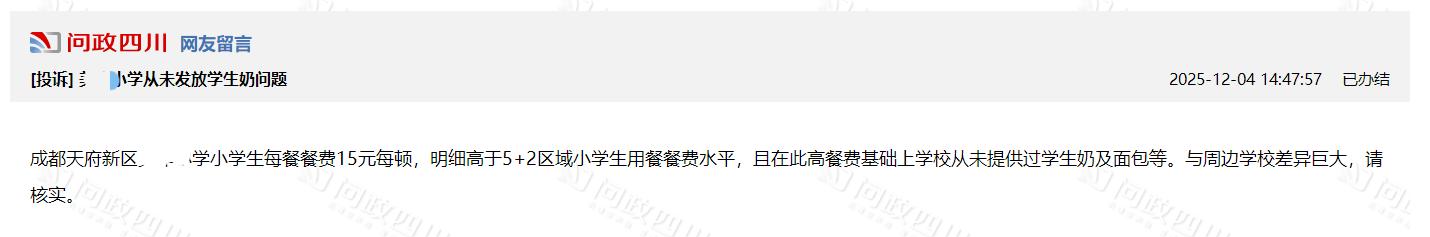 近日,有网友在问政平台上留言,反映成都某小学未给学生发放学生奶问题。
