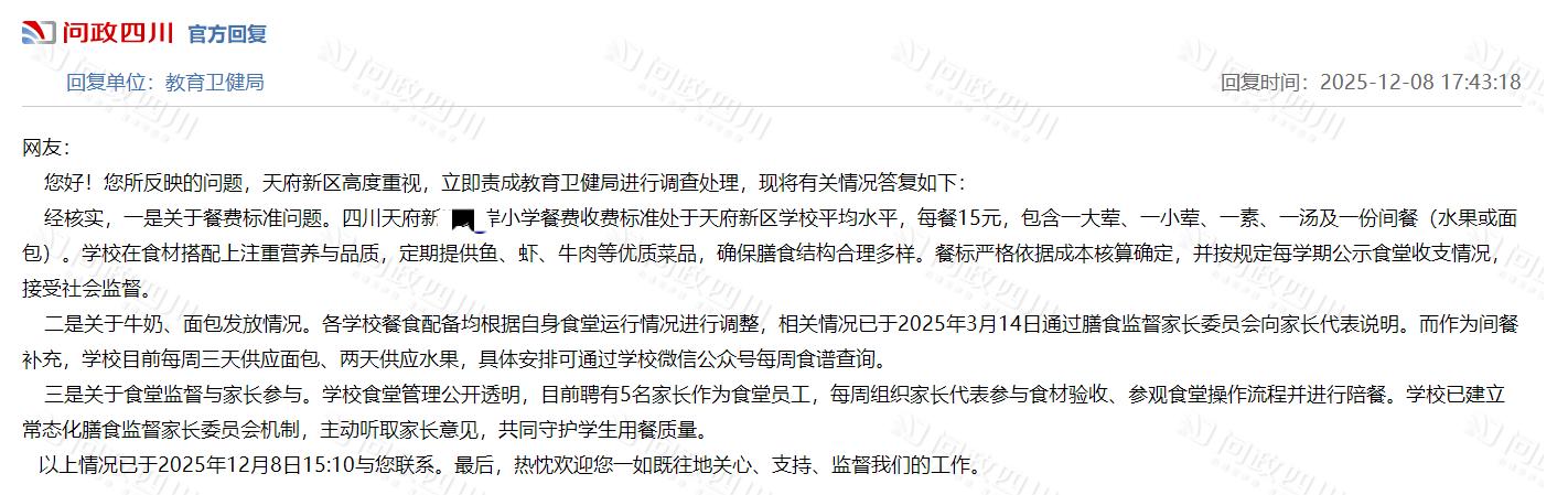 该网友表示,该学校对每个小学生的收费标准是15元/顿,明显高于成都“5+2”区域小学生的餐费水平,但是在高餐费的基础上,学校却从未提供过学生奶及面包等,与周边学校差异巨大,要求相关部门核实。