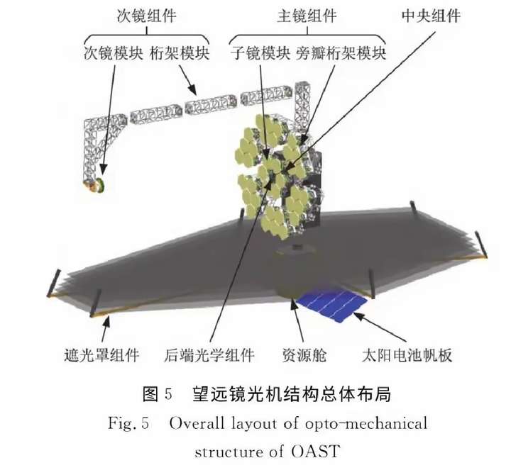 杂志曝光的这一技术相关的空间望远镜就采用了这一创新设计理念,其光机结构包括同轴式的主镜组件和次镜组件、次镜桁架、中央模块、遮光罩以及资源仓。主镜组件由中央子镜模块和旁瓣子镜模块组成,这种拼接式主镜组件设计,便于火箭运载,降低了对运载火箭的要求,运载上行代价低,并且在轨组装难度低、在轨调校效率高。