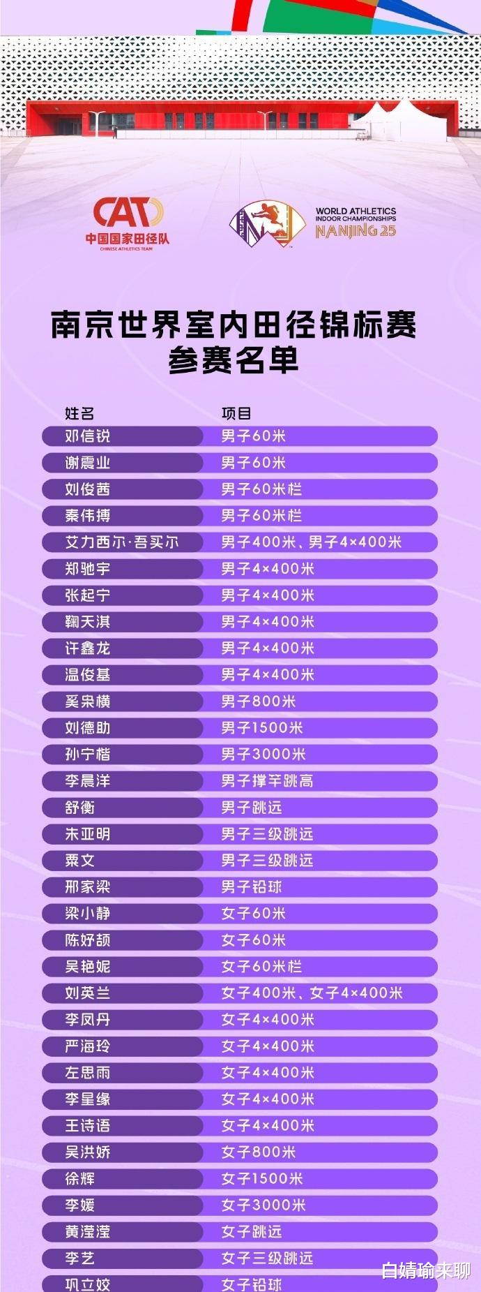 中国田径,蓄势待发,剑指南京室内世锦赛!2025年南京世界田联室内锦标赛,是中国首次承办这项顶级室内田径赛事,也是继2015年北京世锦赛后,中国田径再次在家门口迎接世界挑战。3月21日至23日,南京市体育训练中心室内田径馆“南京魔方”将成为全球田径爱好者瞩目的焦点。35位中国田径健儿将披挂上阵,在22个项目中力争佳绩,展现中国田径的风采。