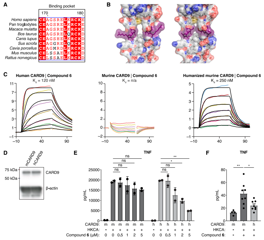 在原代人树突状细胞中,化合物6可选择性抑制真菌触发的炎症因子释放,并阻断CARD9下游的NF-κB p65磷酸化。由于小鼠CARD9的“甘氨酸孔”与人源存在序列差异,化合物无法结合。研究团队构建了人源化CARD9小鼠模型,在该模型中,化合物6能有效抑制系统性真菌感染引发的炎症因子风暴。