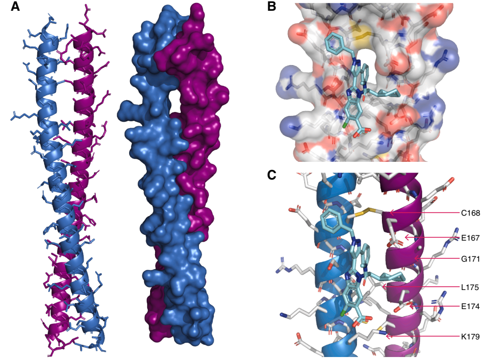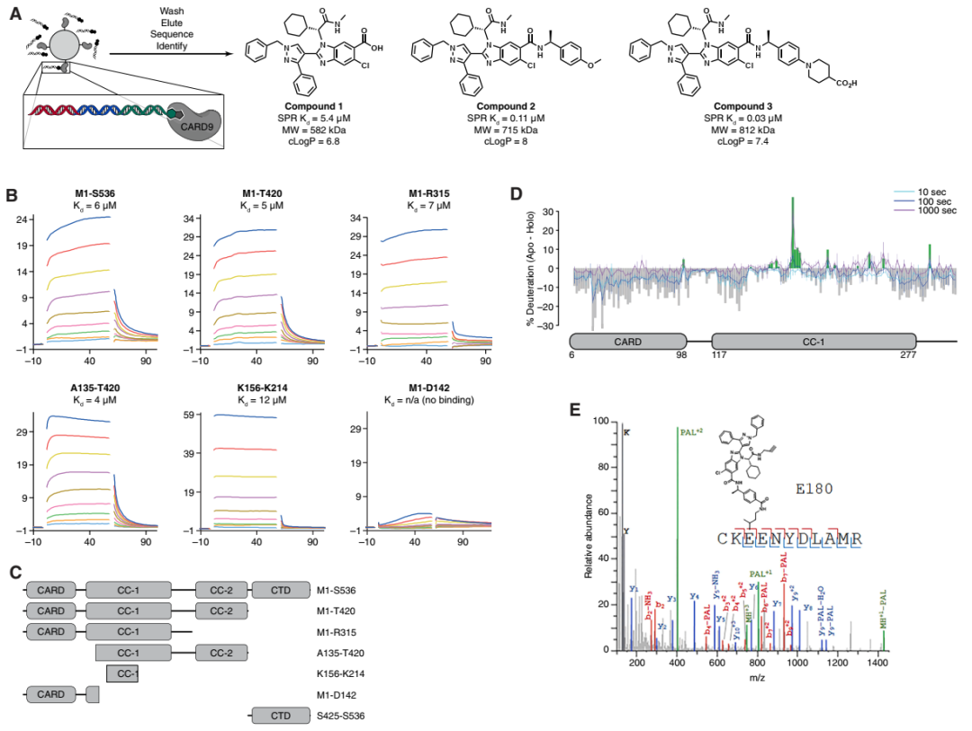 尽管缺乏功能活性,但该系列化合物为定位CARD9上的结合位点提供了关键工具。通过SPR、HDX-MS和光亲和标记技术,将结合位点定位于CC1结构域中的一个独特“甘氨酸孔”口袋。