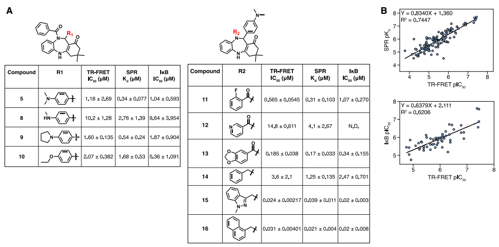 鉴于初始苯并咪唑结合剂不具备功能调节活性,团队创新性地建立基于时间分辨荧光共振能量转移(TR-FRET)的配体置换筛选平台:通过对约80万分子库的筛选与多轮验证,发现了一个苯二氮䓬类化合物系列。