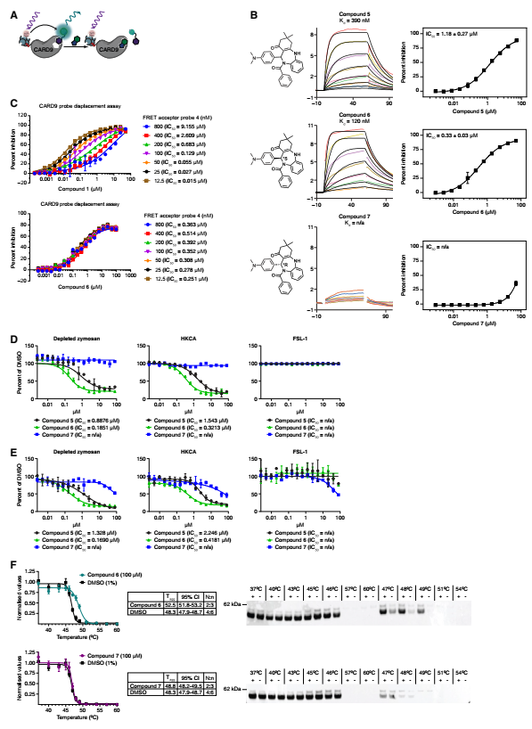 活性对映体化合物6能有效置换探针,且在SPR实验中显示与CARD9结合,而其对映体7则无活性。值得注意的是,苯二氮䓬化合物6的抑制活性不随探针浓度增加而改变,表现为非竞争性抑制模式,提示其可能通过变构机制发挥作用。