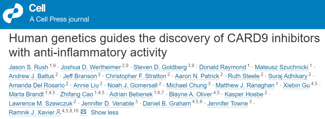 研究以“Human genetics guides the discovery of CARD9 inhibitors with anti-inflammatory activity”为题发表在《Cell》上。