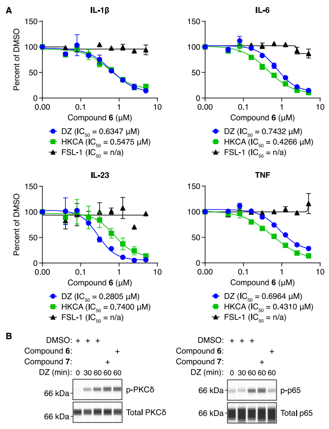 图6. 原代人类细胞中CARD9信号传导的选择性抑制及通路特异性