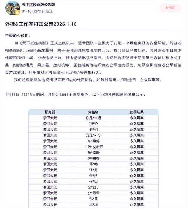 能让玩家安心搬砖赚钱,离不开官方的硬核保障。官方坚决打击外挂脚本等异常牟利行为,致力于为所有真实玩家提供更流畅、更公平的大荒之旅。为此,《天下贰·经典版》祭出史上最严厉措施,采取运营强干预的模式,严格对脚本行为进行监测,针对异常批量起号的行为进行智能识别与画像圈定,开服首批已累计处罚2486个违规角色。
