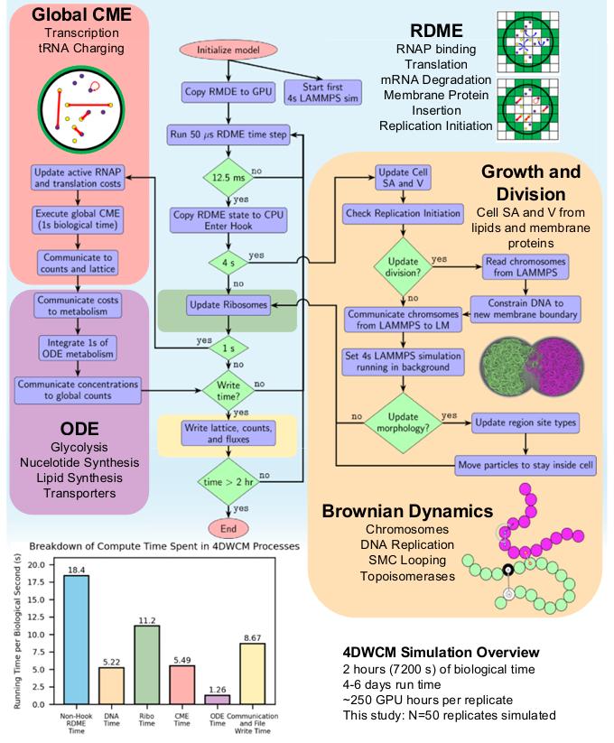 不过要模拟一个细胞的全部过程,没有哪一种计算方法能独自胜任。因此团队的做法是把四种不同的模拟方法组装成一个混合框架:空间中的反应和扩散用 RDME(Reaction-Diffusion Master Equation,反应-扩散主方程)处理;全局的转录和 tRNA 装载等反应用 CME(Chemical Master Equation,化学主方程)做随机模拟;糖酵解、核苷酸合成等代谢网络用 ODE(Ordinary Differential Equations,常微分方程)求解;染色体的物理行为:聚合物运动、DNA 复制、蛋白驱动的环挤出,则用布朗动力学(Brownian Dynamics)在第二块 GPU 上并行模拟。