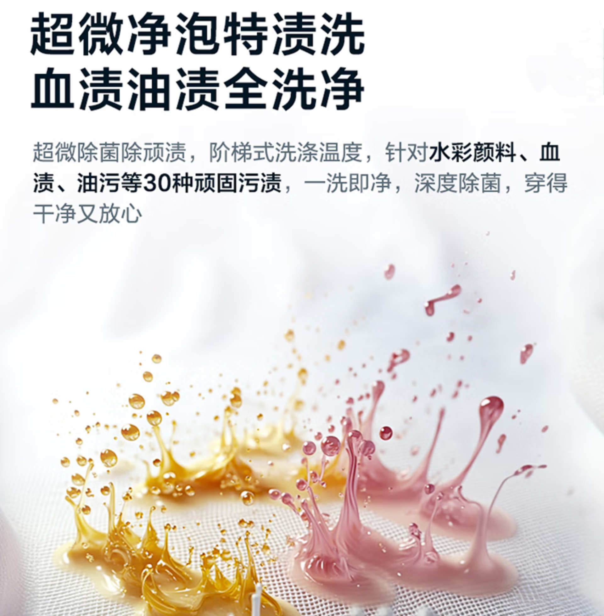 这款洗衣机还具备 AI 智投功能,能自动感应衣物重量与材质,精准匹配洗涤剂用量,再也不用担心洗涤剂放多放少的问题,省心又环保 。在除菌方面,它采用了全域除菌技术,结合 Ag + 银离子除菌和超微除菌气泡水,能够有效杀灭衣物上的细菌和螨虫,除菌率高达 99.99% ,为家人的健康保驾护航 。