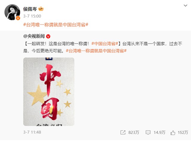 而侯佩岑这位台湾艺人的态度也让人纷纷称赞,她是第一个转发“台湾省称谓”的明星。