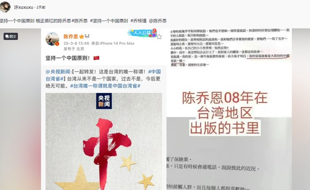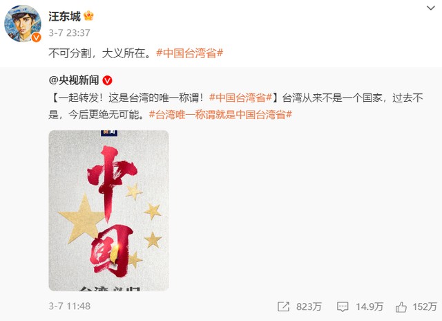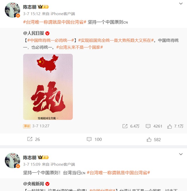 但值得一提的是,陈志朋在台湾问题上的态度十分明了,在3月7日分别转发了央视新闻和人民日报的动态。