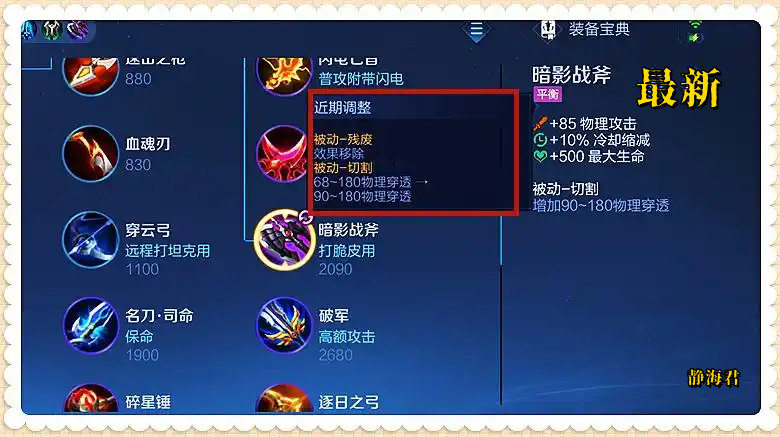 综上,尽管暗影战斧被削弱了一轮又一轮,它也依旧是大多数战士英雄的首选,除非将来策划彻底移除它的物穿属性,或者新加入一件真伤装备,不然它的地位肯定无可动摇。