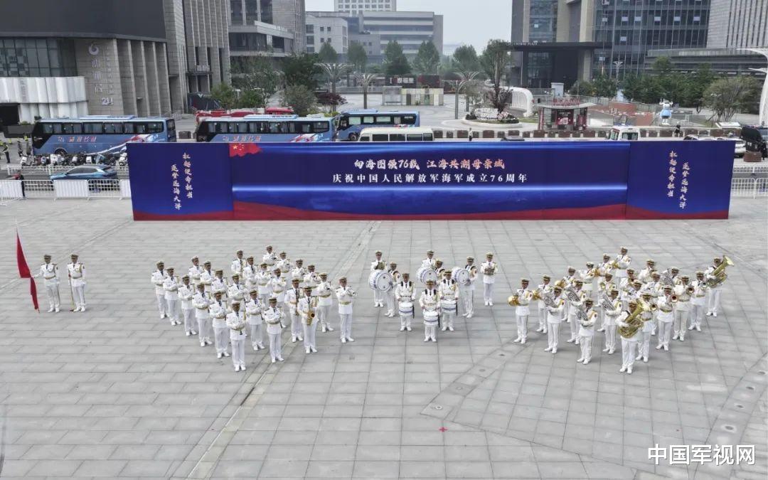 当《人民海军向前进》的旋律奏响时,乐队方阵裂变成双箭头队形,如同劈波斩浪的舰艇编队,瞬间引爆市民欢呼。演奏的队伍继而又化作闪亮的五角星与“76”字阵,以铿锵音符纪念人民海军成立76周年。