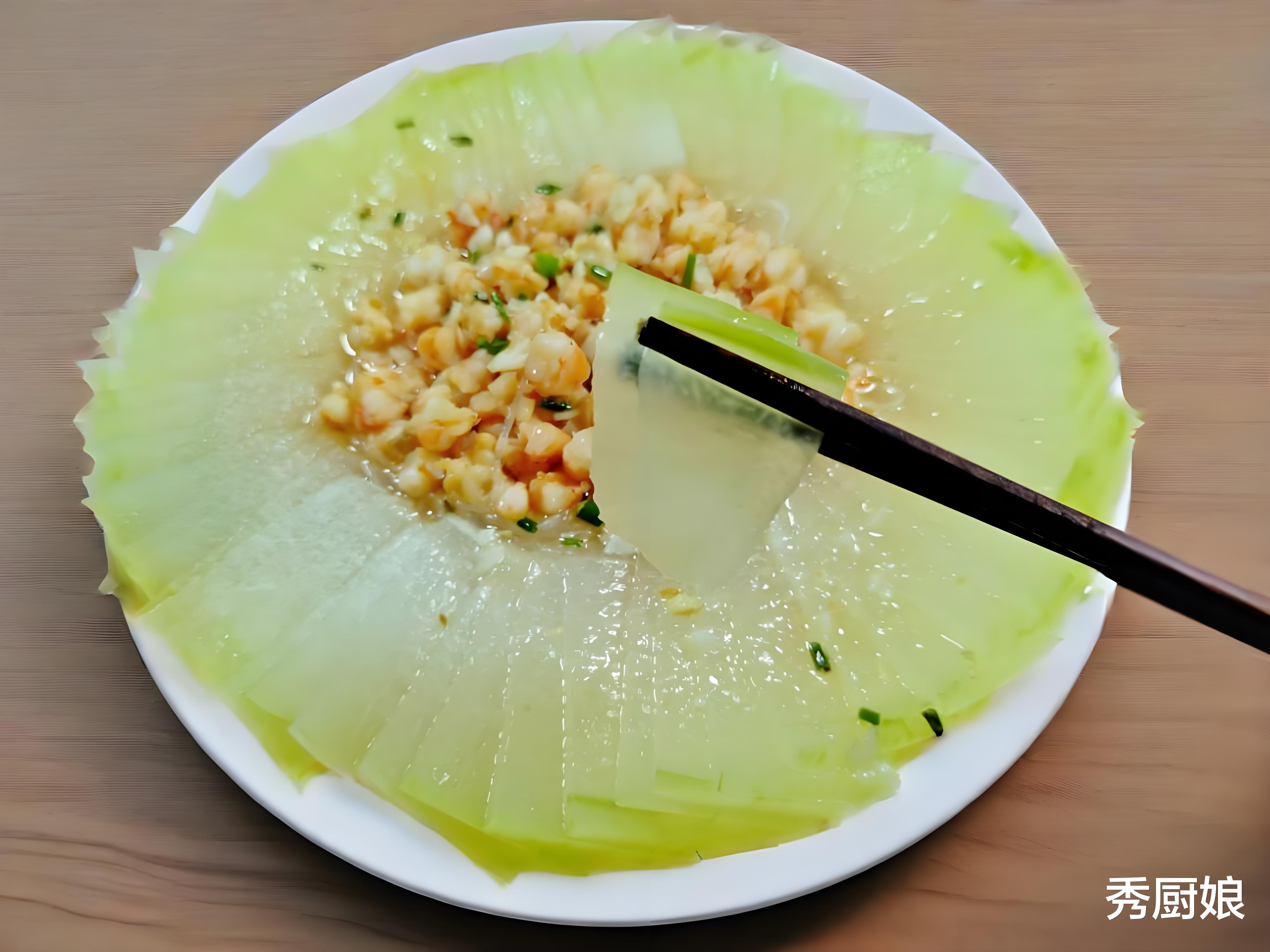 1. 冬瓜去皮切薄片铺在碗底;