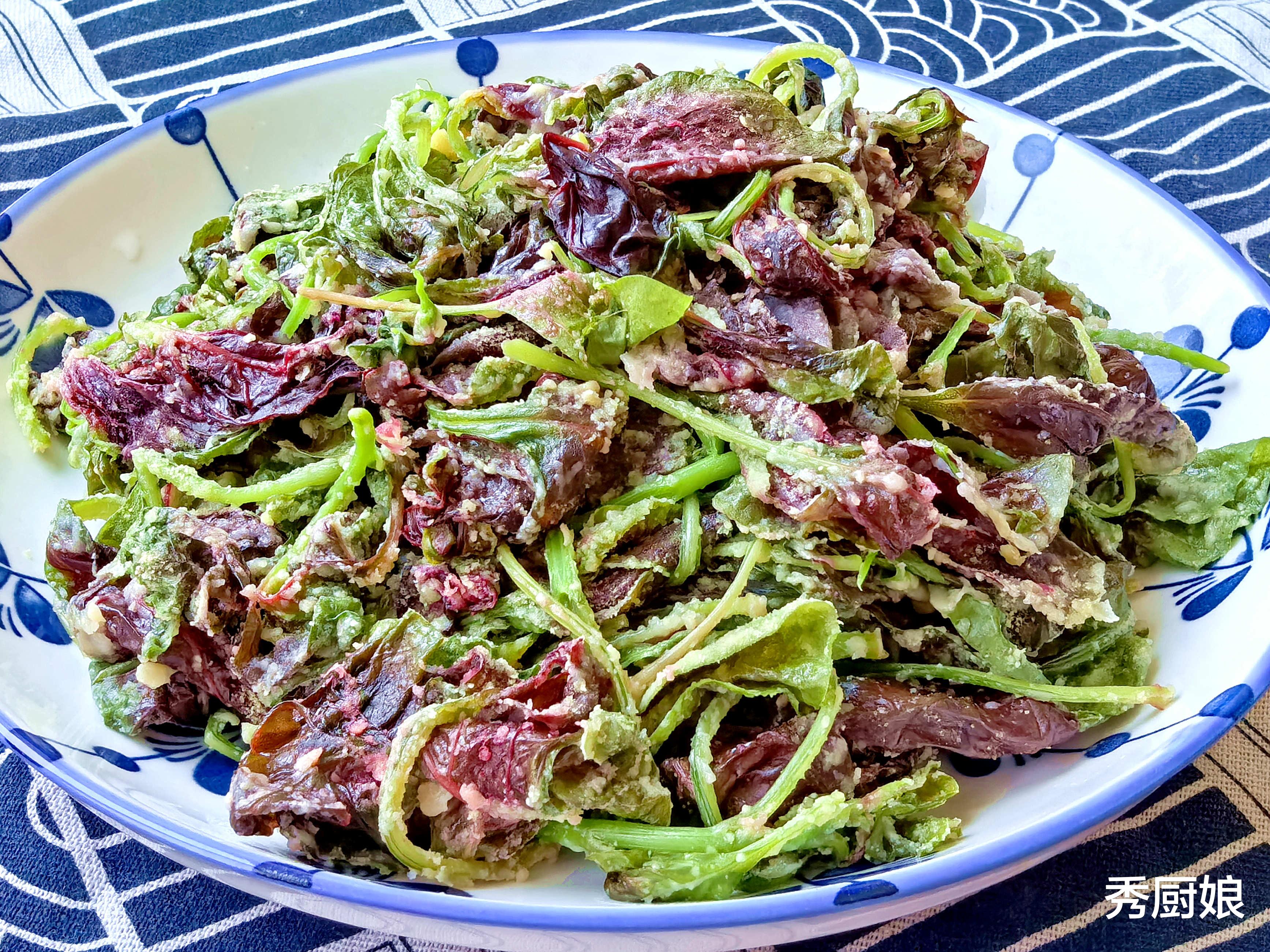 红苋菜可是“补钙小能手”,钙含量比牛奶还高!蒸出来的菜叶软乎乎的,裹上面粉后口感更滑嫩,蒜香和香油一激,孩子根本吃不出“草味”。关键是红苋菜的汤汁是粉红色的,拌饭特别有食欲,补铁效果也一流!