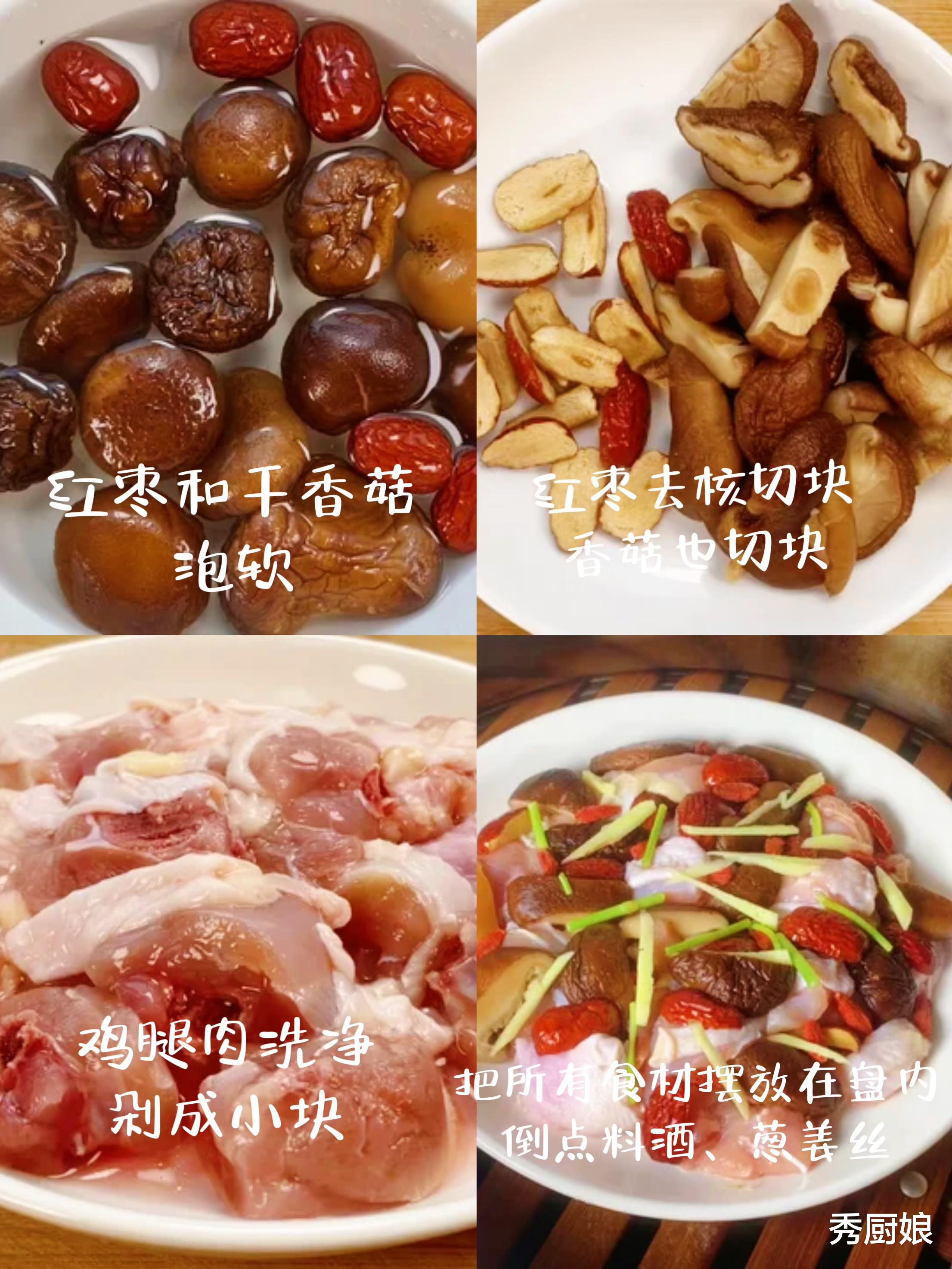 食材:鸡腿肉2个(去骨切块)、干香菇8朵、红枣5颗、姜丝少许