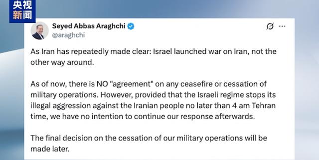 停火协议涉及两个12小时的停火期,伊朗将启动首个12小时停火,以色列将随后进行第二个12小时停火,24小时后,战争将正式宣布结束。
