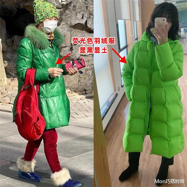 可我想告诉你,荧光色的亮面羽绒服堪称 “显胖显黑双 buff”。因为荧光色的饱和度很高,穿在身上就像是一个行走的红绿灯,还会衬得肤色暗沉,黄黑皮千万不能穿。再加上亮面材质反射光泽感,会加剧羽绒服的膨胀效果,显胖得不行。