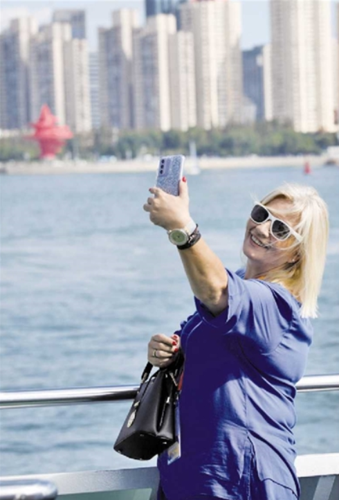 外国游客在奥帆中心体验“海上看青岛”。