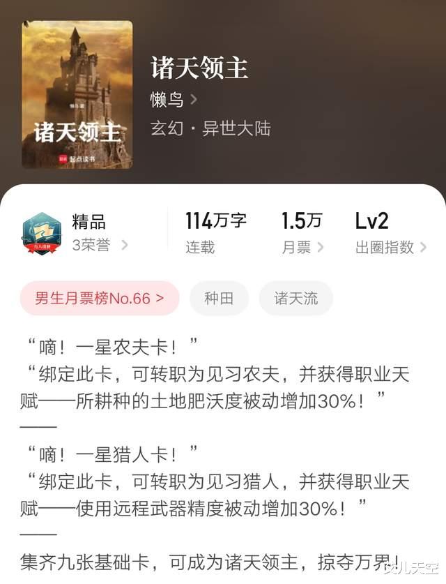 懒鸟之前的作品有《我是杀毒软件》《农夫凶猛》《疯狂建村令》《全民远征:拯救修仙界》等等,之前作品也多能写到精品,属于比较稳定的一类作者。