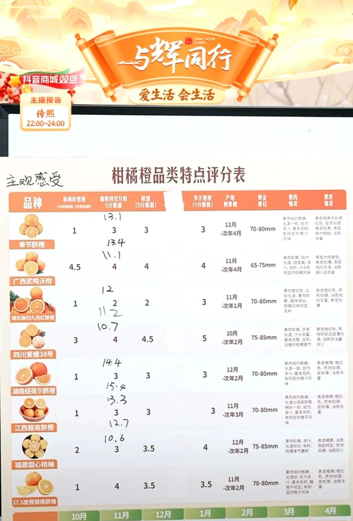 宇辉举办果蔬专场,主要介绍之前的橙子和苹果,特别是在对比各类橙子的时候,宇辉运用了各种技术和人工手段,结果测评了一个寂寞!给出的结果是都很好吃!被网友戏称宇辉直播摸鱼划水一小时,随后宇辉用一杯美味的橙汁,造就了一段封神的名场面!