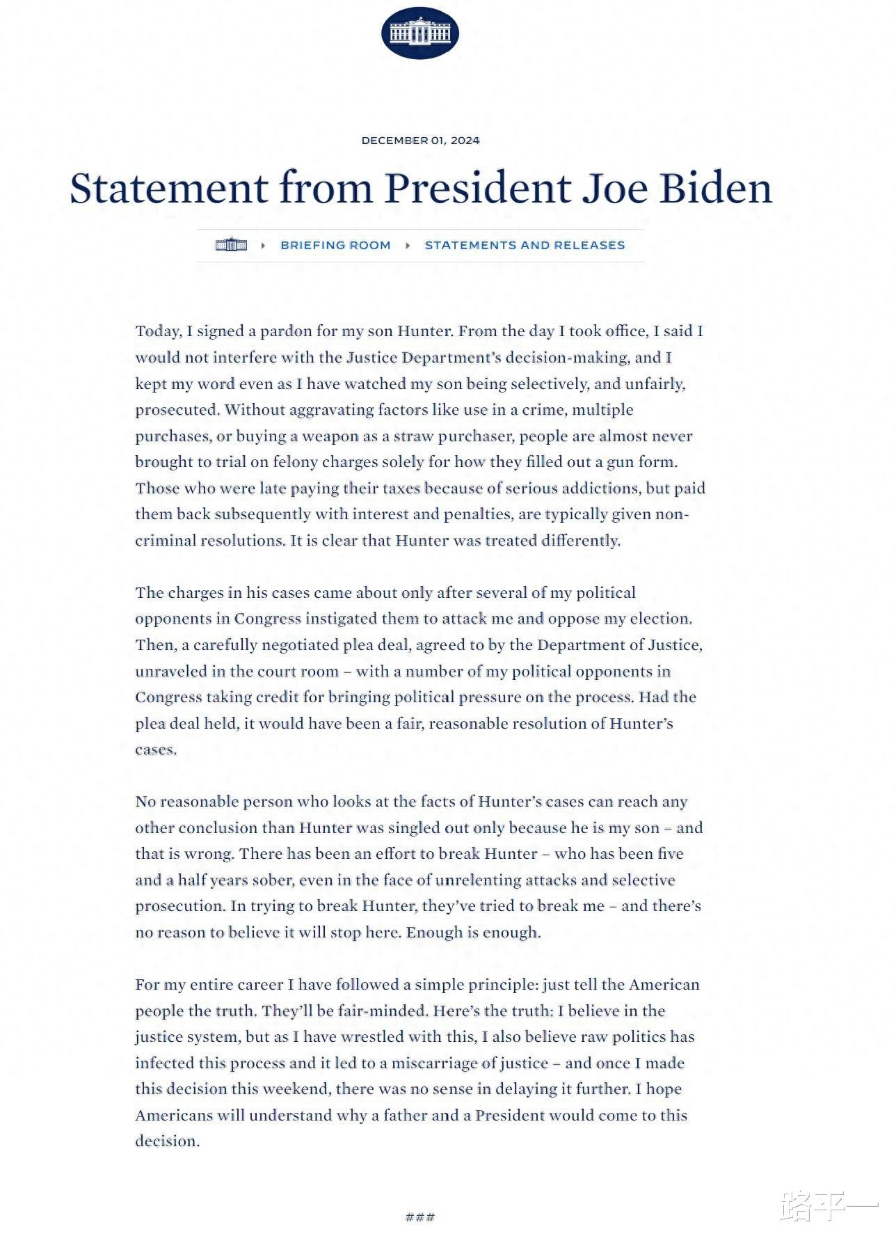 拜登说了啊,从我上任那天起,我就说过不会干涉司法部的决策,尽管我看到我的儿子被选择性地、不公平地起诉,但我还是遵守了诺言。但是我儿子不一样,我儿子是受到了区别对待,这一切都是对手在打击我和我儿子,所以,我签署了我儿子的赦免令。