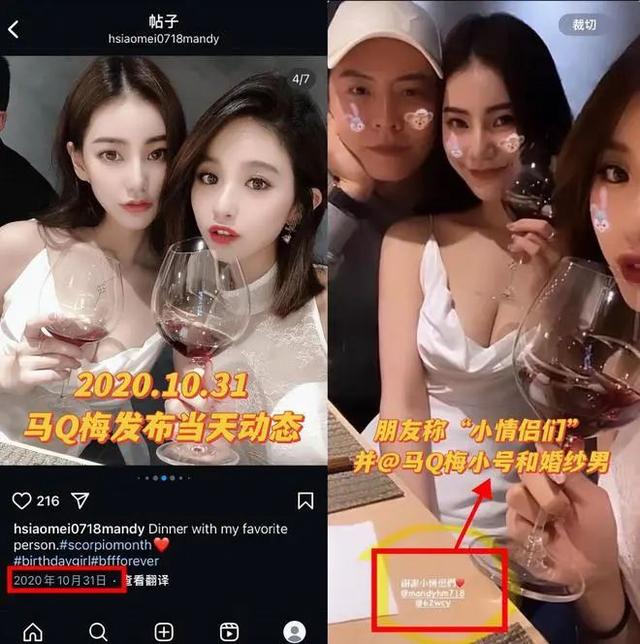 拍婚纱也许能解释成工作需要,可后续操作就有点耐人寻味了。2020年 10月,马筱梅晒和好友的合影,愣是把“婚纱男”给裁掉了。