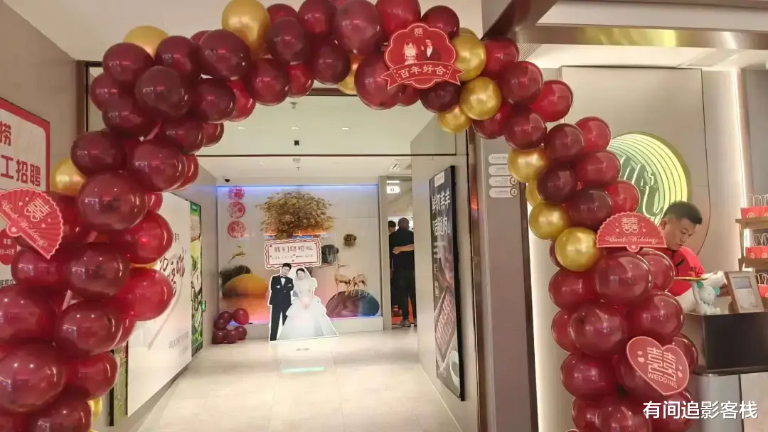 婚礼当天,这家海底捞一片喜气洋洋,门口摆上了新人的人形立牌,还装饰了红色气球拱门。