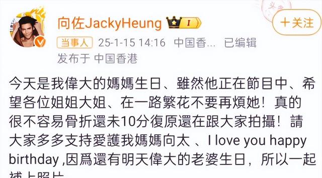 向佐在社交平台上发声,表示希望《一路繁花》的姐姐们不要再烦他妈妈向太。