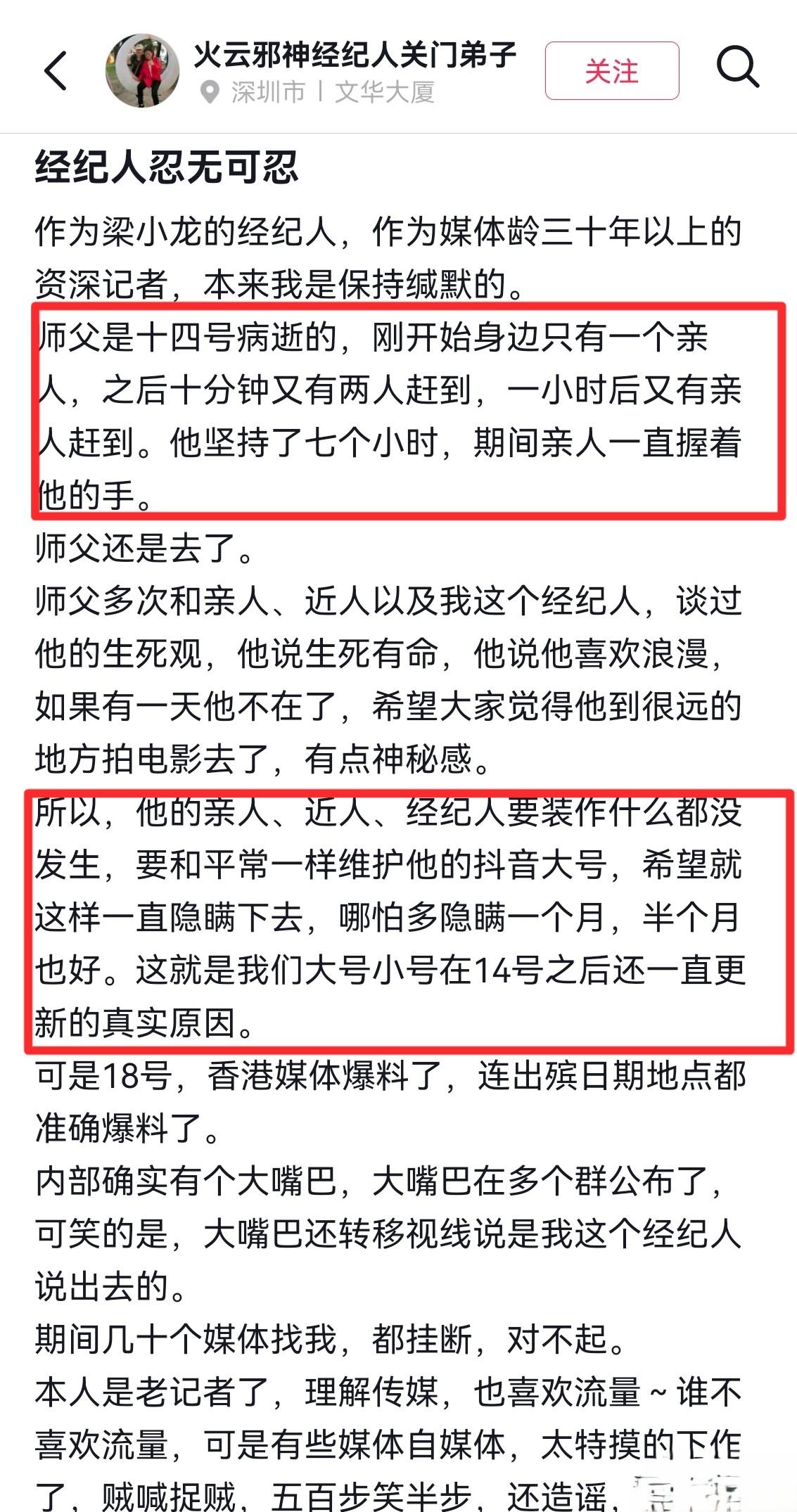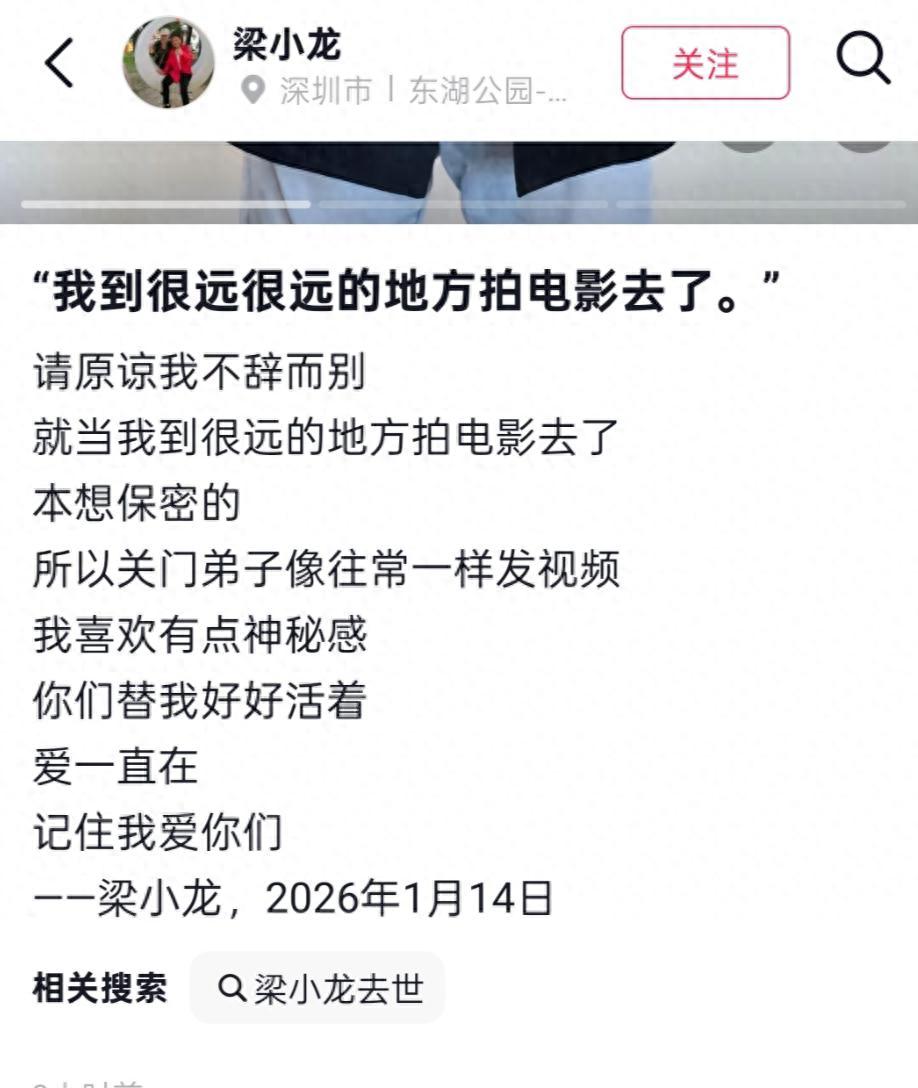 此前账号更新引发的热议,也终于有了答案。1月18日噩耗曝光时,梁小龙的个人视频账号仍在正常更新内容,不少网友疑惑不已。随后负责运营账号的“徒弟”发文解释,原本想暂时隐瞒噩耗,让大家缓一缓,所以按原计划发布了他生前提前拍好的视频;经纪人也补充说明,消息提前泄露,是因为内部知情人员在群聊中无意提及,才引发全网震动。这份迟来的澄清,更让人体会到世事无常的沉重。