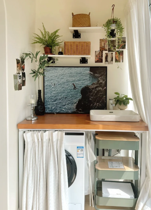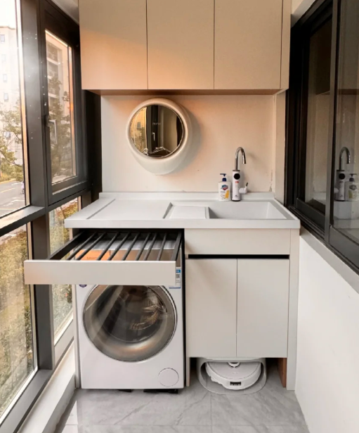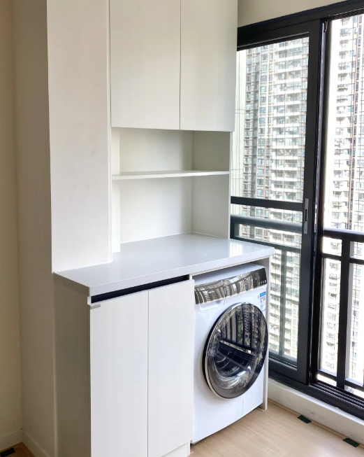 而洗衣机也好、洗手池也好,或者是烘干机,基本都是需要嵌入在柜子里面的。