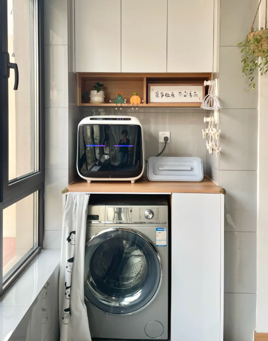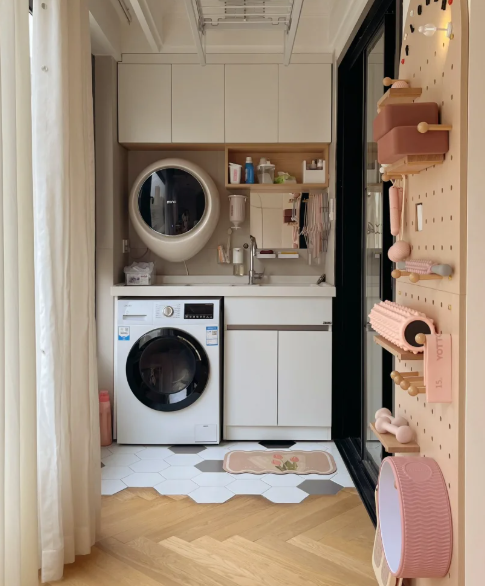 我家装修的时候,本来想着洗衣机放在卫生间,但是设计师跟我说,卫生间面积小,放洗衣机的话,可能会压缩空间。