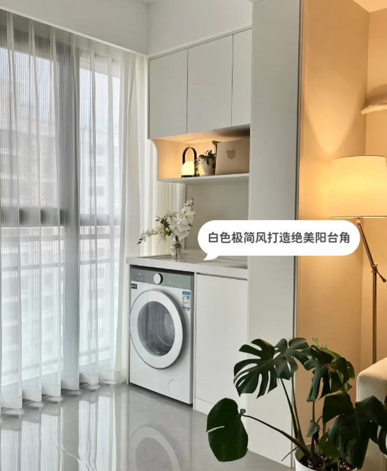 如果是L型阳台的话,可以把洗衣机分布在两侧,再利用好转角空间进行收纳。