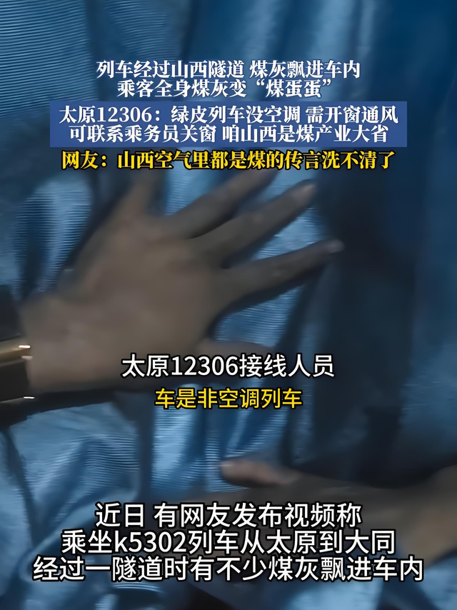 近日,一列途经山西雁门关隧道的列车上演了令人啼笑皆非的一幕。6月7日,多位乘客在社交平台晒出视频,记录下K5302次列车通过隧道时的"惊魂"经历——大量黑色粉尘突然涌入车厢,将乘客们瞬间变成了"煤蛋蛋"。