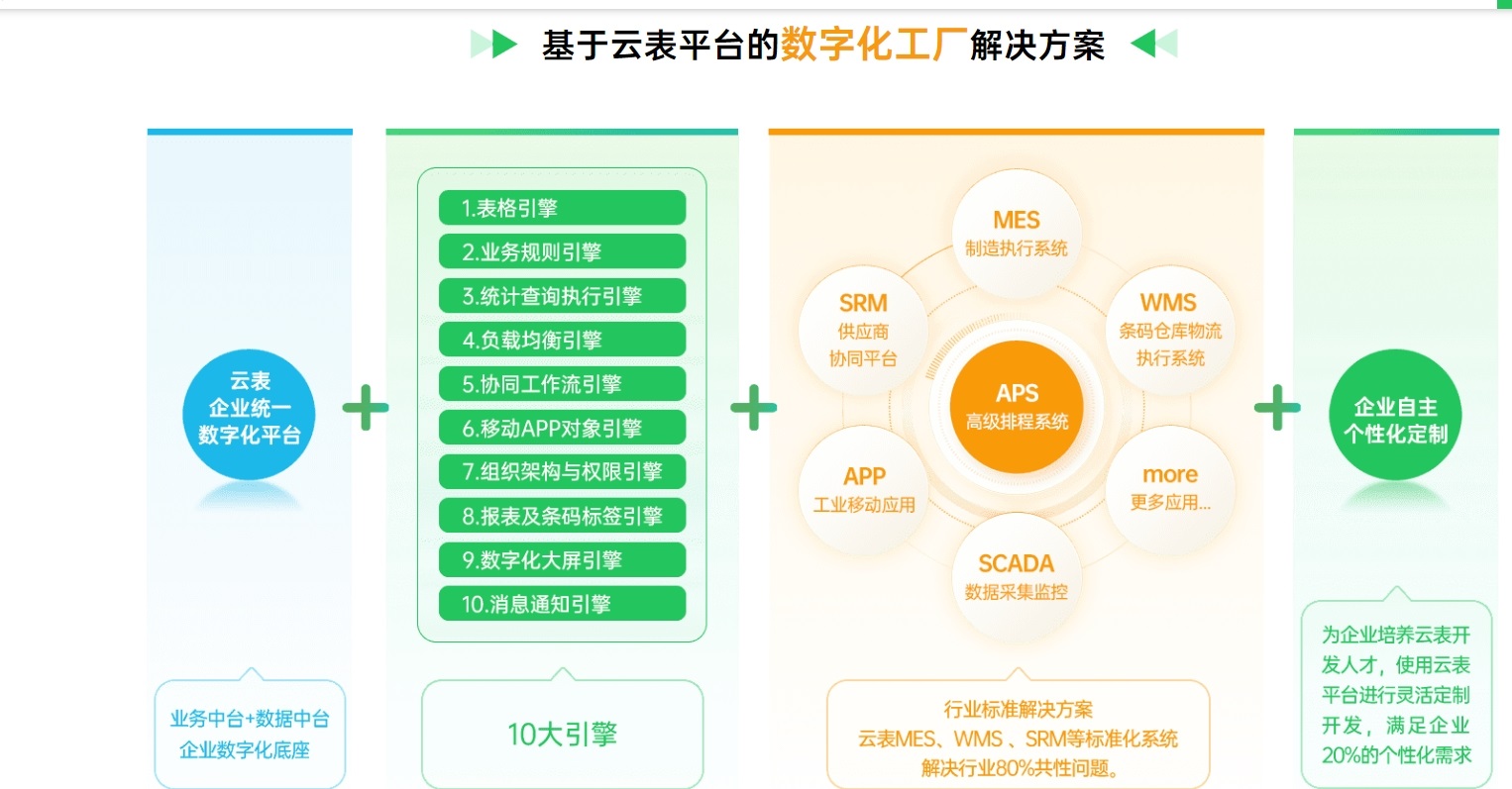 云表平台还内置功能强大的10大引擎,包括移动APP、数字化大屏、报表、组织架构与权限等等。