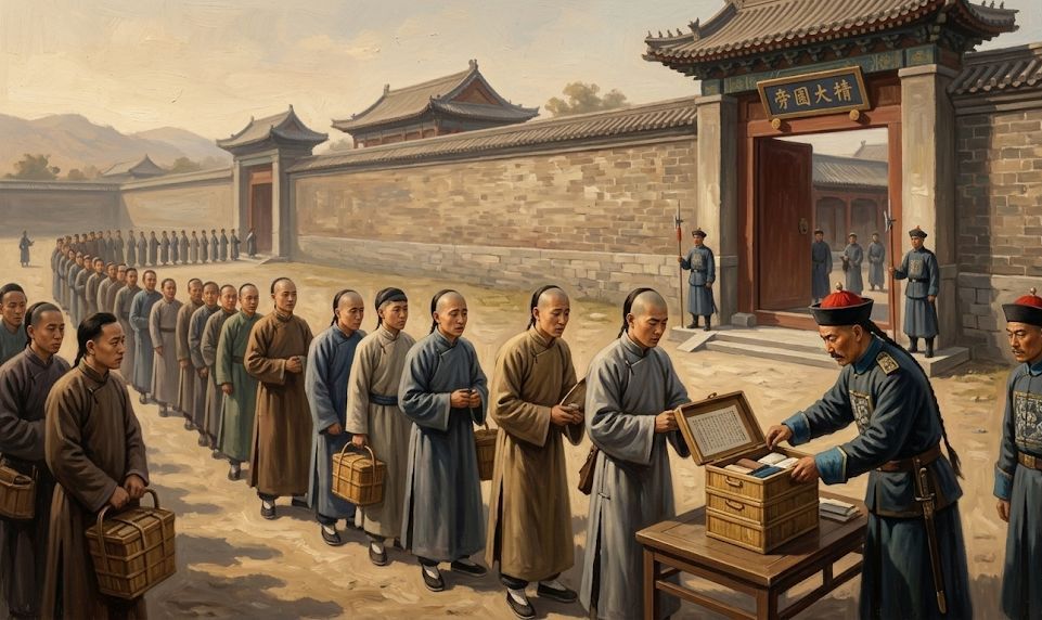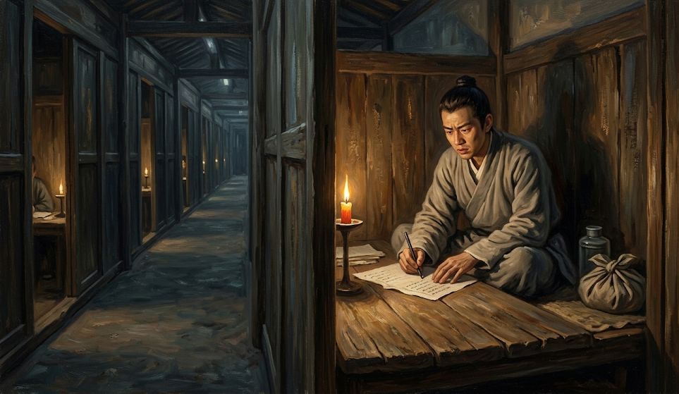 你想想那个场面。几千个考生关在一排排的小格子间里,外面有士兵巡逻。白天答题,晚上就着一根蜡烛继续答。隔壁传来磨墨的声音和偶尔的咳嗽声,除此之外一片寂静。你蹲在这个比厕所大不了多少的空间里,手上拿着一支笔,面前摊着一张决定你后半辈子命运的试卷。