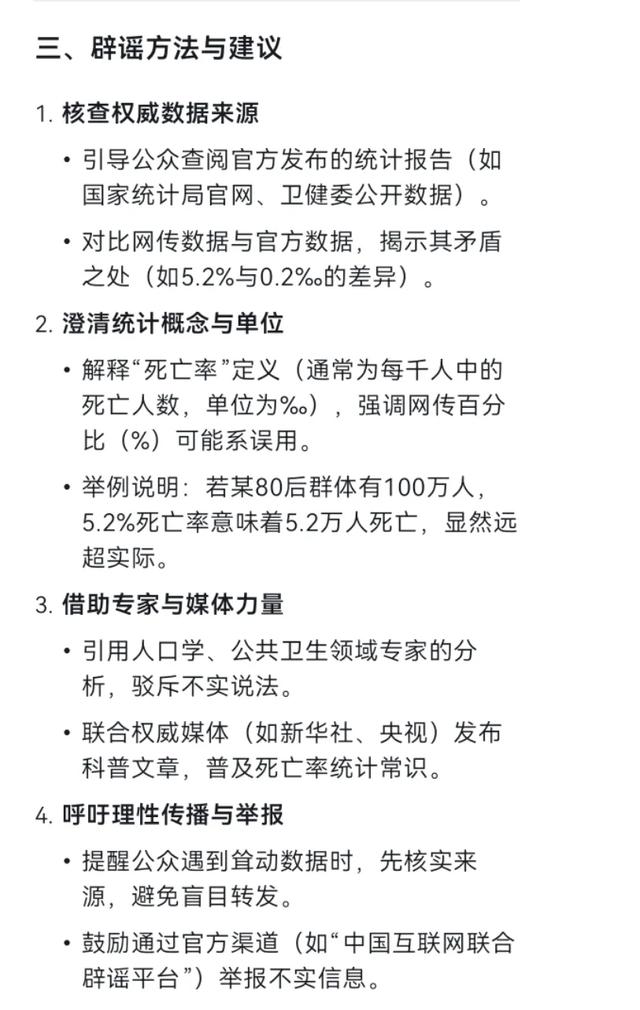 DeepSeek 不仅列举了网络数据存在的主要问题,还列举了权威数据及谣言背后传播的原因等……