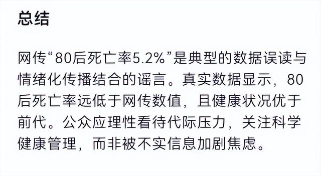 DeepSeek 总结:网传“80后死亡率5.2%”是典型的数据误读与情绪化传播结合的谣言。真实数据显示,80后死亡率远低于网传数值,且健康状况优于前代。