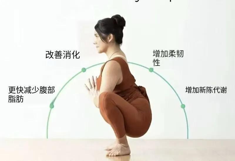 瑜伽蹲的好处伸展和打开大腿内侧、腹股沟肌肉、跟腱和小腿肌肉刺激消化器官和新陈代谢,平衡骶髂关节,增强腹部肌肉